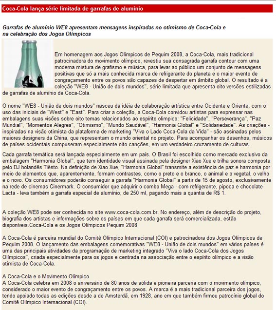 15/08/2008 11:05 - Coca Cola lança série limitada de garrafas de alumínio