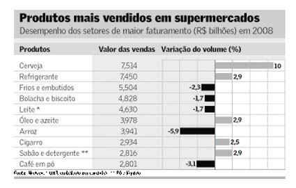 Outro dado da pesquisa mostra queda no consumo de arroz (-5,9%) e alta no de cervejas (10%). "O brasileiro comprou mais cerveja no supermercado para consumir em casa devido à lei seca", diz o especialista. O arroz, segundo ele, vendeu menos devido à alta provocada pelo encarecimento das comodities no início do ano.